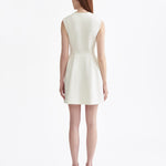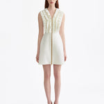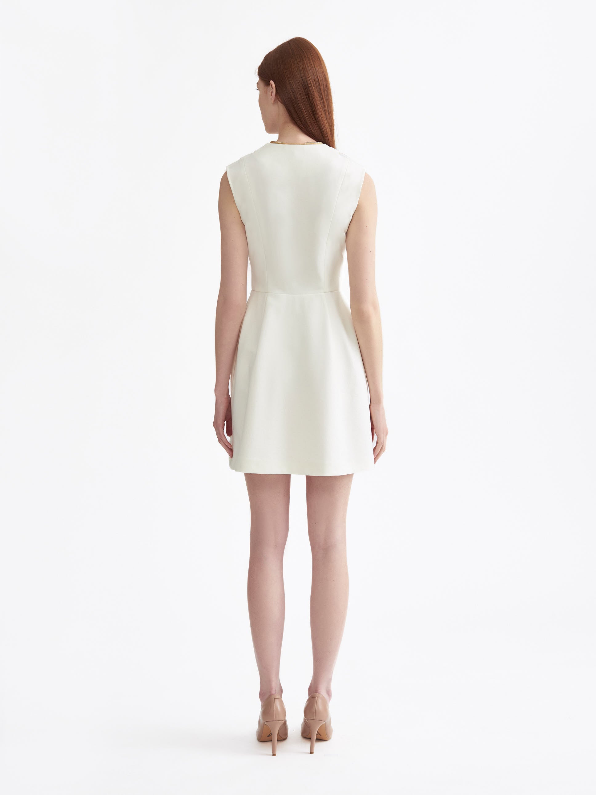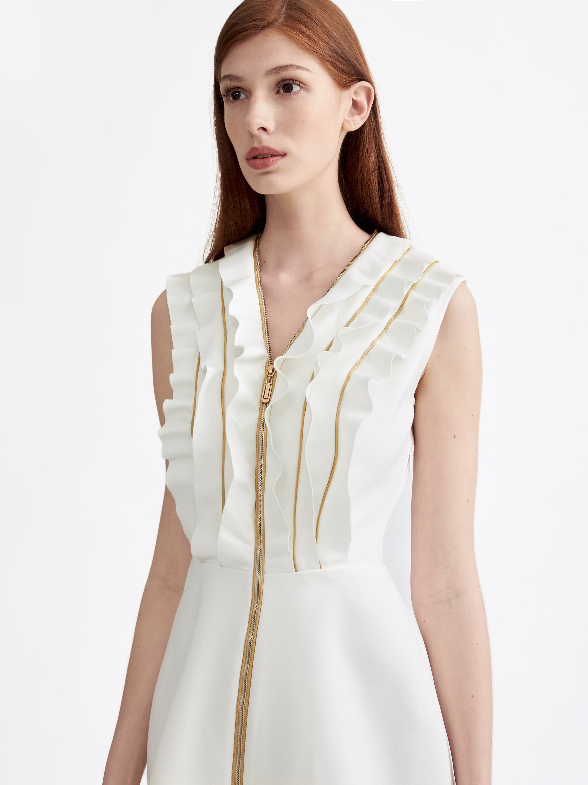 The Dove Dress is a refined and playful piece in soft dove white. Made from structured cotton, this sleeveless mini dress features front ruffle detailing enhanced with vertical silk ribbons. A gold zipper runs all the way from hem to neckline, adding a modern twist to the romantic silhouette. This design effortlessly combines softness and edge — perfect for summer days and standout occasions.