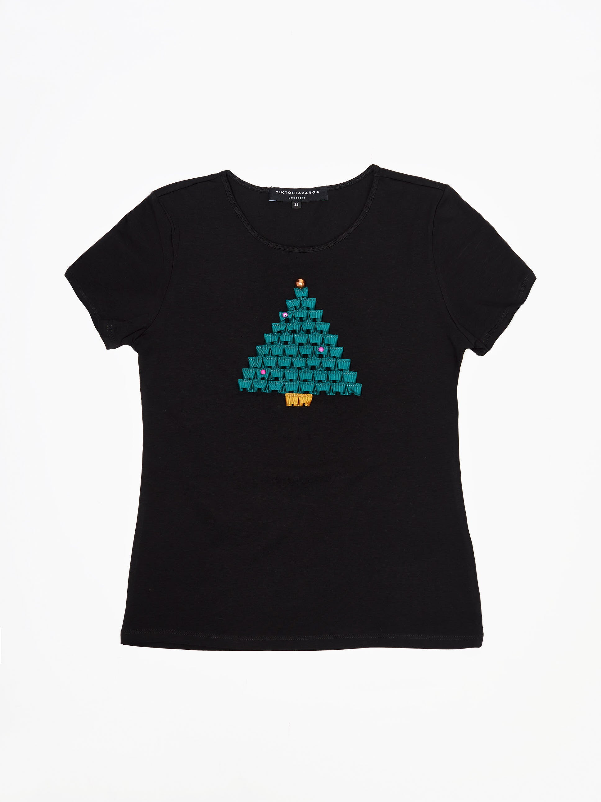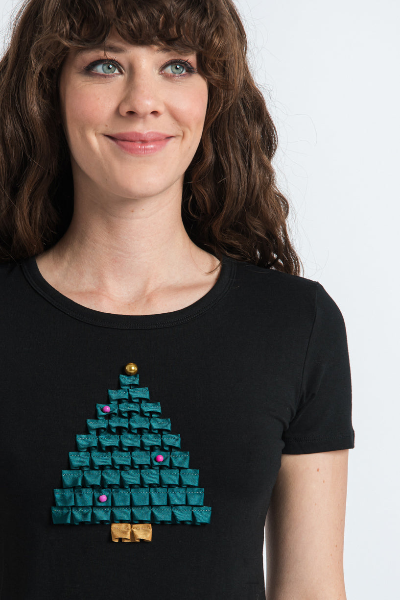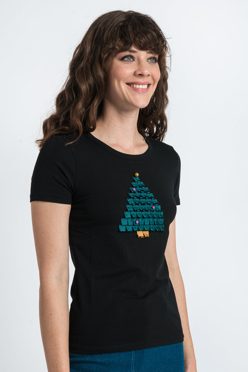 A soft cotton T-shirt with a fitted silhouette, featuring a hand-applied Christmas tree motif made from folded silk ribbons. The joyful tones evoke the warmth and sparkle of the festive season, while the minimalist design keeps it elegant and timeless. Also available in other colours. A piece that captures the spirit of Christmas, perfect both for yourself and as a thoughtful gift.