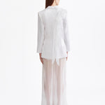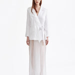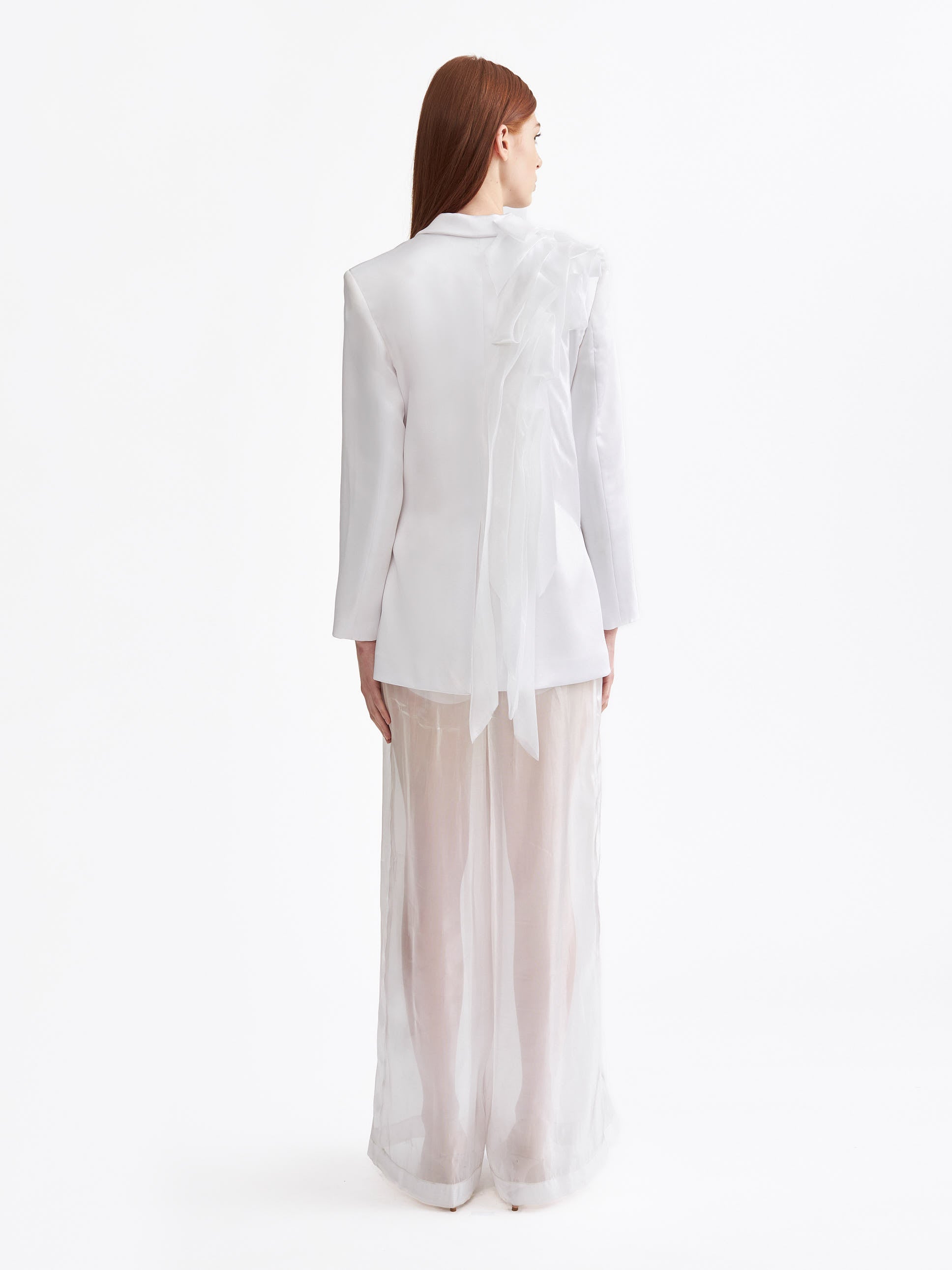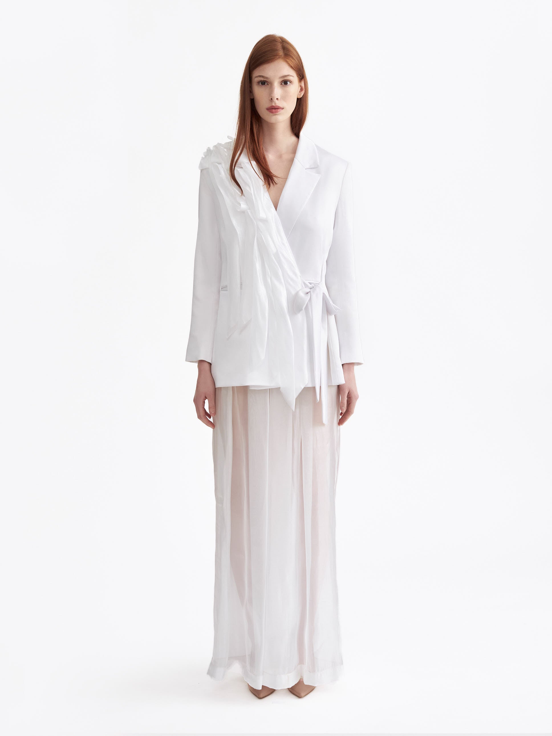 A légies és könnyed Üvegfény Szatén Nadrág áttetsző, üvegszerű fényű szaténból készült. A rendkívül bő nadrágszár lágyan követi a mozdulatokat, elegáns és súlytalan hatást keltve. A magas derekú fazon és a finoman szabott derékrész gyönyörűen ellensúlyozza a szabadon omló szabást, így hosszított, időtlen sziluettet alkot. Kiváló választás különleges alkalmakra vagy modern menyasszonyi megjelenéshez.
