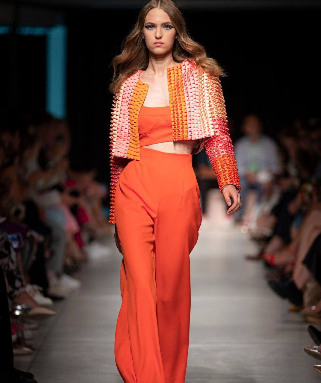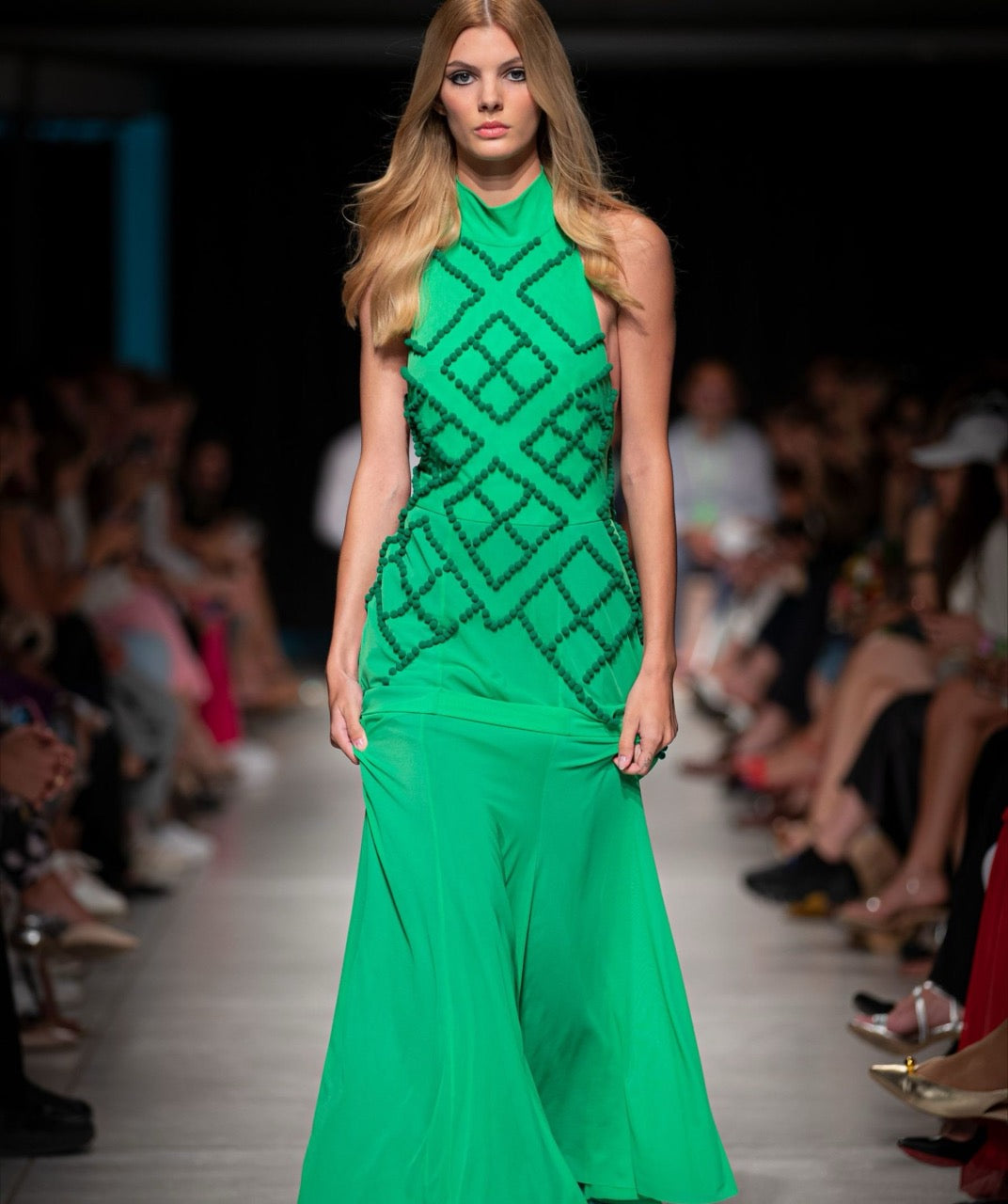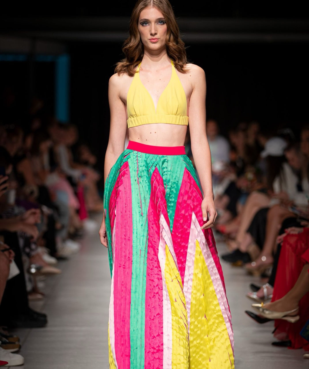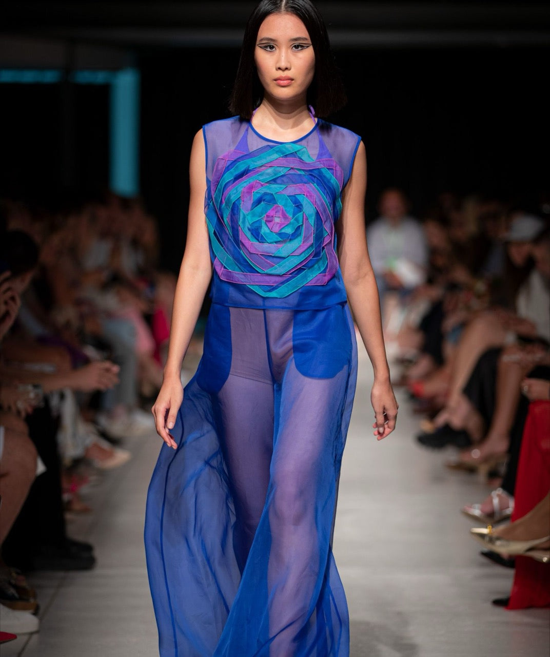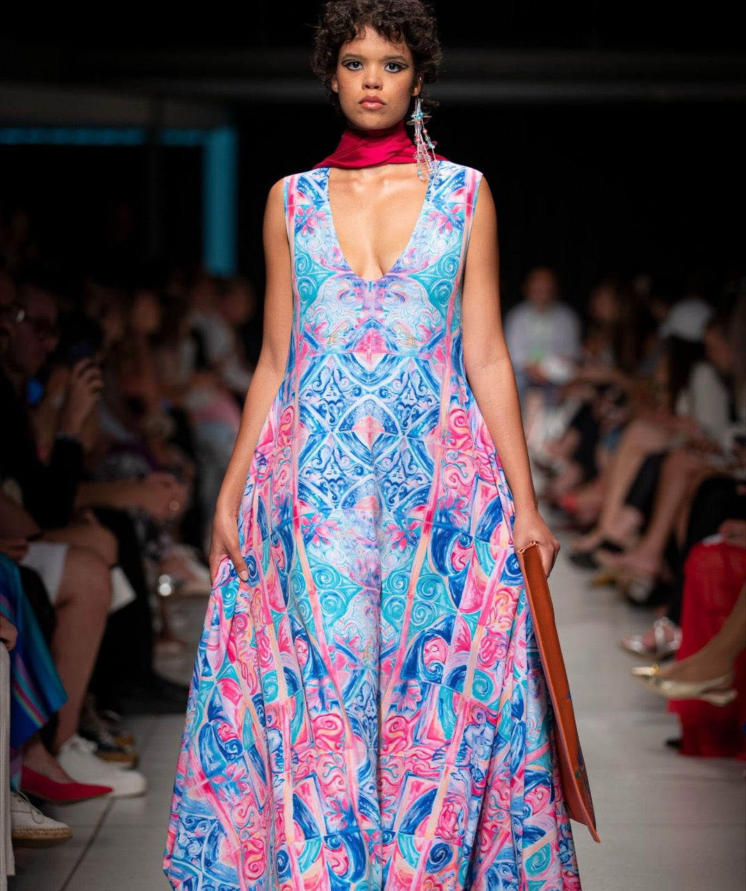 VIKTORIAVARGA SS24 is a vibrant and joyful collection inspired by Portugal’s street art, traditional tiles, and mesmerizing blue skies. The collection embodies the country’s rich cultural heritage, blending intricate azulejo patterns with bold colors and dynamic forms. Viktoria Varga’s signature design elements—ribbons, pom-poms, and striking color combinations—are elevated with new silhouettes and artistic craftsmanship. Versatile A-line and straight-cut pieces range from dresses to jumpsuits, light coats, and eveningwear, crafted primarily from silk with touches of neoprene, cotton, tulle, and wool. Standout details include square necklines, exaggerated ribbon accents, and hand-painted 3D ornaments, all contributing to a sense of harmony and playfulness. The collection’s clean, architectural lines and vibrant color palette capture the effortless joy of summer.